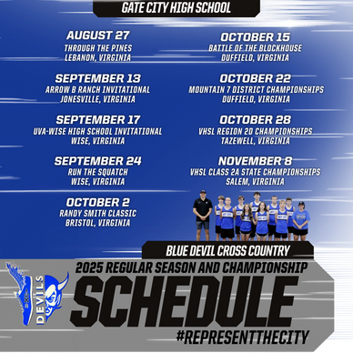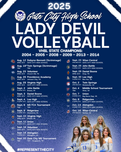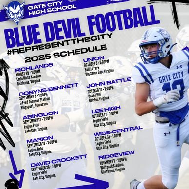 Gate City looks to compete for another Mountain 7 District Championship and 4th consecutive VHSL playoff appearance! Our Blue Devils continue their rivalry with Dobyns-Bennett after 5 decades, and take on TSSAA powerhouse David Crockett, Marion, Richlands, and the best of Southwest Virginia in 2025. *Richlands date has been changed to August 28.